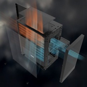 A ház edzett üvegből készült oldalsó panellel van ellátva, amelyet kényelmes hüvelykujjas csavarokkal rögzítünk. Így gyorsan és egyszerűen hozzáférhet a számítógép belsejéhez, anélkül, hogy szerszámokért kellene nyúlnia. Ez a megoldás nagyszerűen működik mind a hardverfrissítésekhez, mind a hűtőrendszer rendszeres tisztításához. A ház előlapja modern, áttört, szellőzőnyílásokkal ellátott panellel rendelkezik, amely nemcsak dinamikus jelleget kölcsönöz az egész háznak, de ami a legfontosabb, segíti a levegő keringését, megvédve az alkatrészeket a túlmelegedéstől.
