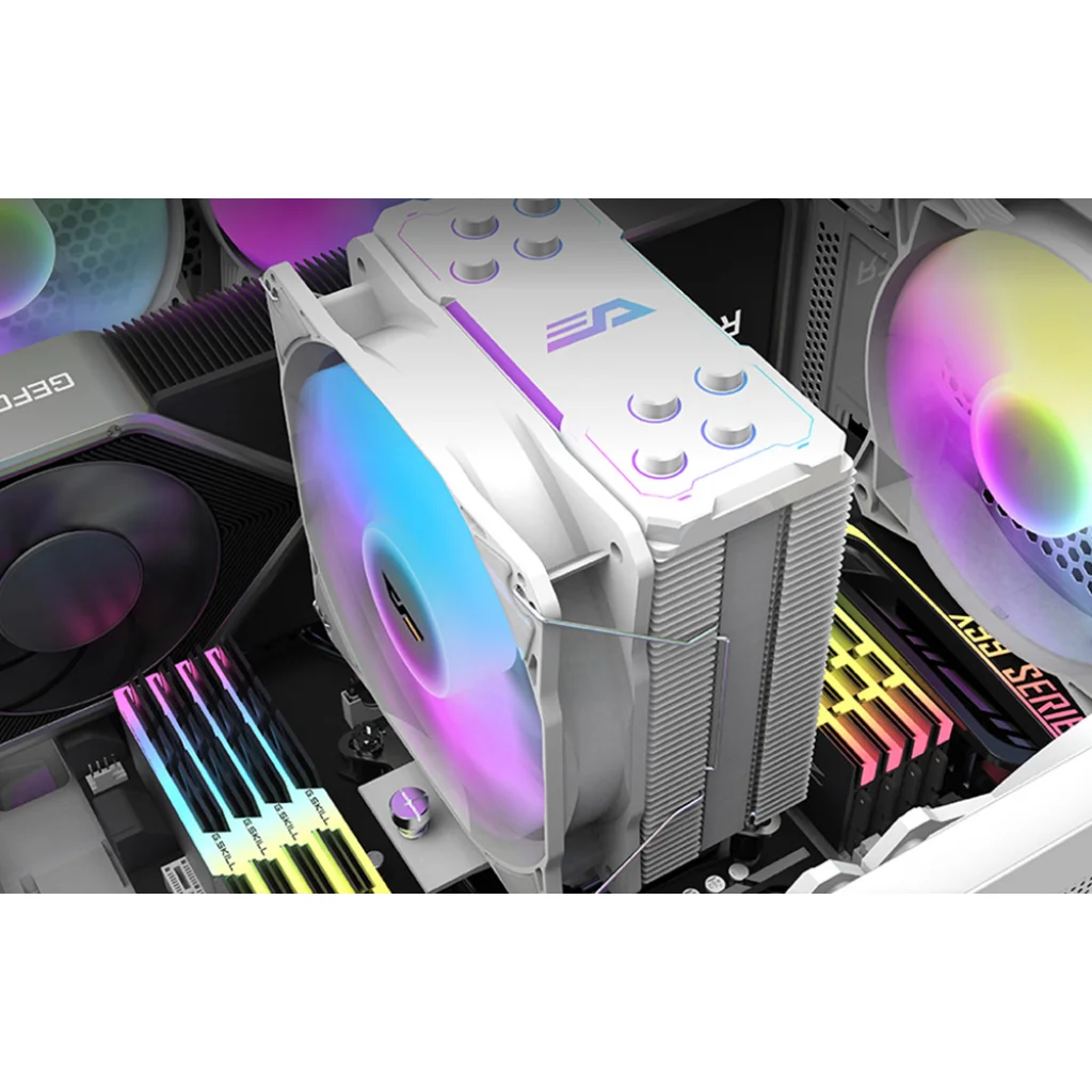A 120 mm-es ventilátor PWM vezérlést használ a fordulatszám automatikus beállításához, így a processzor terhelésének megfelelően állítja be működését, fenntartva az optimális hőmérsékletet, miközben csendesen működik. A ventilátorban lévő hidraulikus csapágy csökkenti a súrlódást, ami tovább csökkenti a zajt és biztosítja a készülék hosszabb élettartamát. Az elegáns design és RGB háttérvilágítás stílusos megjelenést biztosít bármilyen tokban. Szinkronizációs technológiákkal való kompatibilitásnak köszönhetően testre szabhatja a világítási effektusokat.