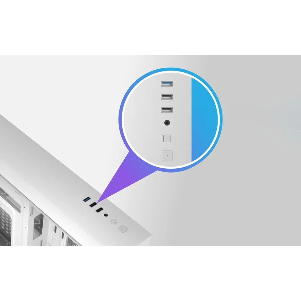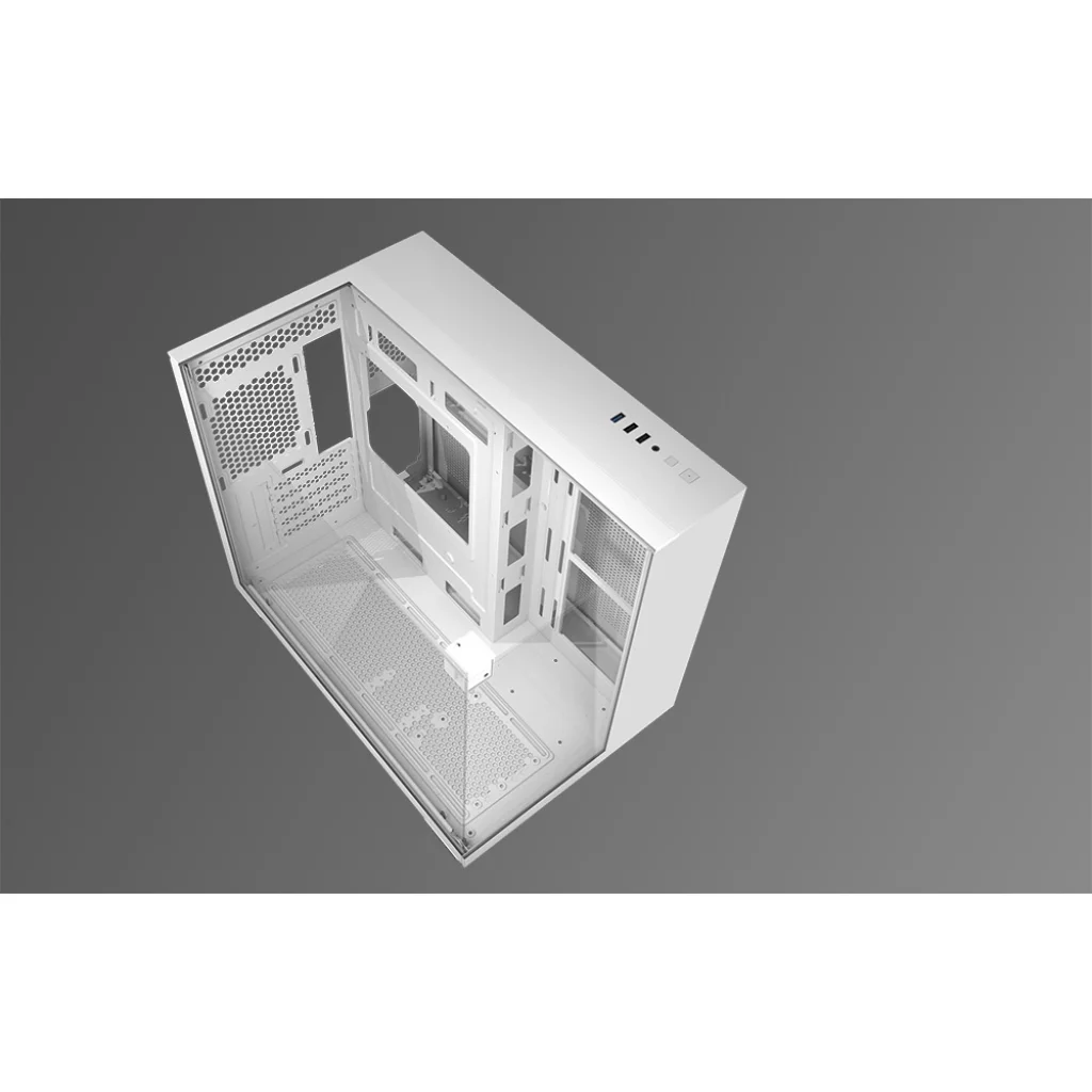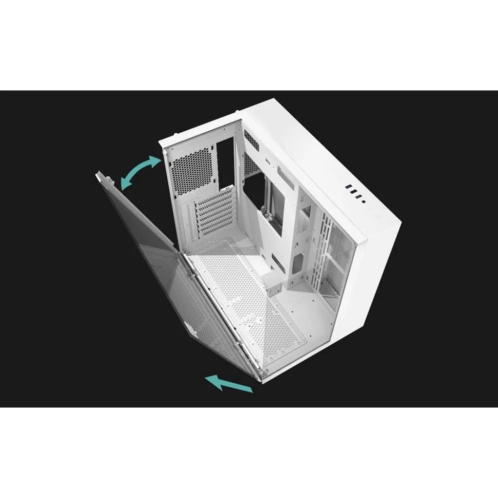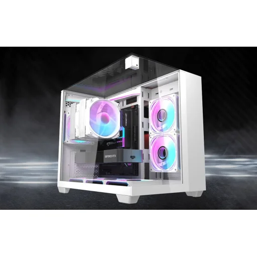 Átlátszó kialakítás három oldalon: A tokot nem kevesebb, mint három átlátszó, edzett üvegből készült panel különbözteti meg, amelyek lehetővé teszik, hogy könnyedén megtekinthesse a beállítás minden részletét. Az átlátszó kialakítás nemcsak az alkatrészek esztétikáját emeli ki, hanem lehetővé teszi, hogy könnyedén ellenőrizze az alkatrészek állapotát és a hűtés hatékonyságát. A hüvelykujjas csavarral szerelt oldalsó panel megkönnyíti a gyors hozzáférést a tok belsejéhez. Munkaterülete mostantól futurisztikus dizájnjával lenyűgöző lesz.