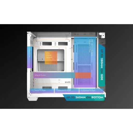 Fejlett hűtési képességek: A TH285M-et az optimális légáramlást szem előtt tartva tervezték. Akár hat 120 mm-es vagy két 140 mm-es ventilátort, valamint 360 mm-es vízhűtést is támogat. Ez a konfiguráció még intenzív rendszerterhelés mellett is alacsonyan tartja a hőmérsékletet, így ez a ház ideális a játékosok és fejlesztők számára, akiknek szükségük van a komponensek stabil működésére.