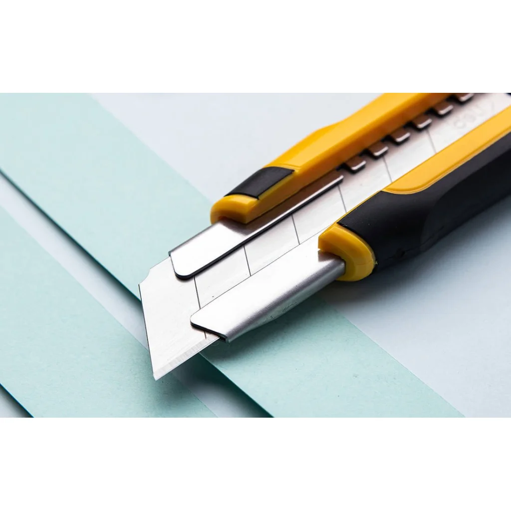 Professzionális és funkcionális vágó a Deli -től. Kiváló minőségű műanyagból készült. Az ergonomikus forma szilárd fogást és kényelmes használatot biztosít, a masszív műanyag gomb pedig lehetővé teszi a penge hosszának megváltoztatását.