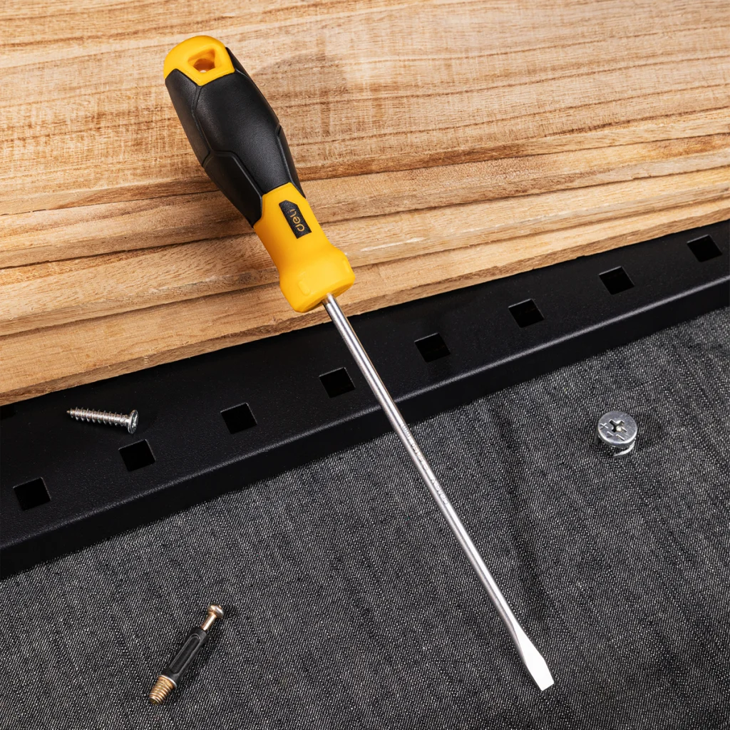 Gyakorlatias és tartós laposfejű csavarhúzó fekete színben. A termék nyele kiváló minőségű műanyagból készült. Praktikus lyukkal rendelkezik, amely lehetővé teszi például szerszámtáblán történő felakasztását. A csavarhúzó tökéletesen illeszkedik a kézbe és rendkívül kényelmes a használata.