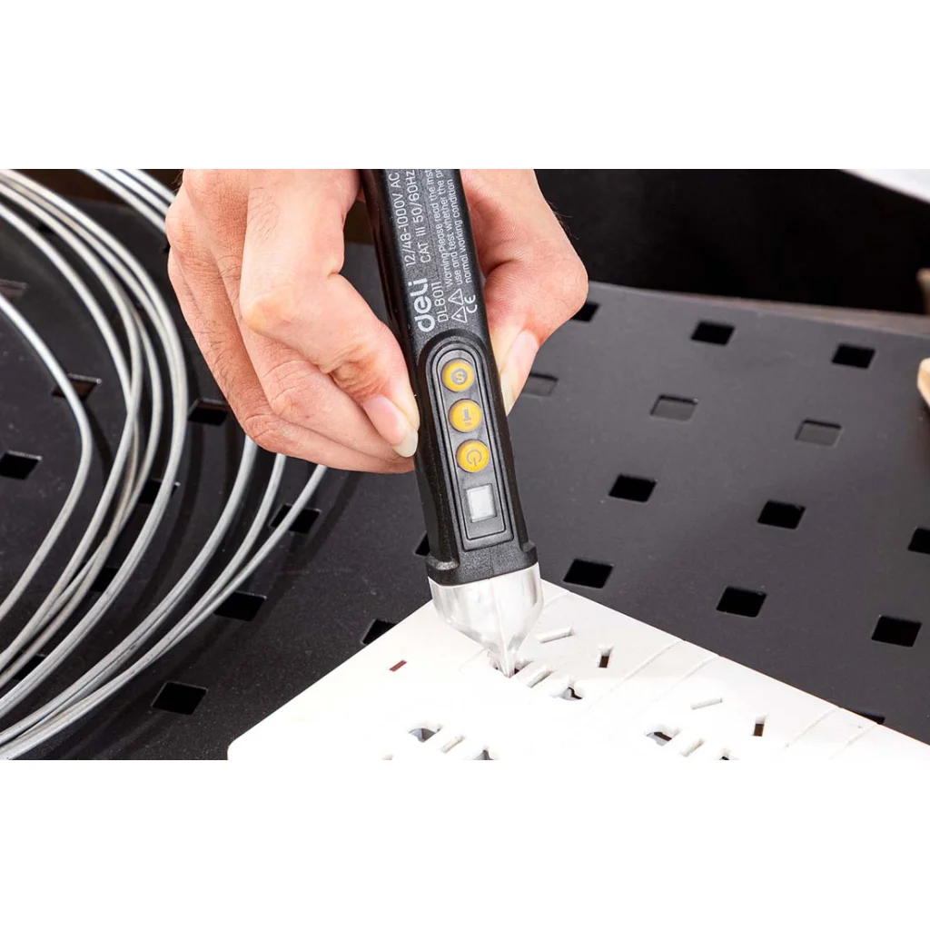 A Deli márkájú feszültségmérő érintés nélküli mérést biztosít állítható érzékenységgel. Gyorsan érzékeli a 12.48V-1000V AC feszültséget. Feszültség erősség jelzőkkel van felszerelve, amelyek 3 színben jelennek meg: piros (magas), sárga (közepes) és zöld (alacsony). Emellett piros LED kijelzővel és hangjelzővel jelzi az élő áramkört. Az egység LED világítással is rendelkezik, hogy segítsen a sötét környezetben végzett munkában. Továbbá, meghatározott idő után automatikusan kikapcsol, hogy energiát takarítson meg. Két elemmel érkezik, amelyek szükségesek a mérőműszer működéséhez.