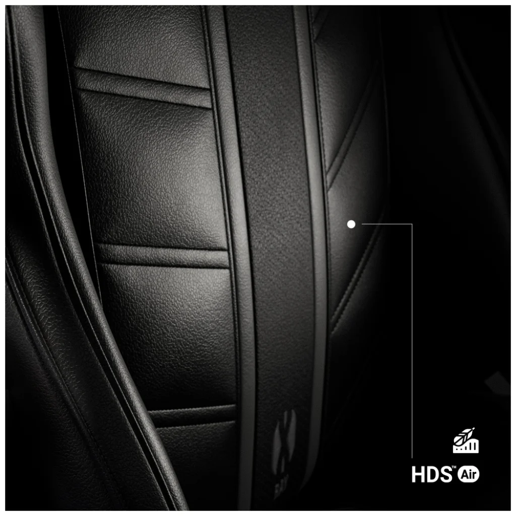 A kárpitozás magas minőségű HDS™ ökobőrből készült, perforált HDS™ Air anyaggal a központi részen, amely javítja a légáramlást és növeli a komfortot. Emellett a szék deréktámasszal és Memory Foam fejpárnával van felszerelve, amelyek a ProSpine Support™ technológiával együtt támogatják a gerincet és csökkentik a fáradtságot még hosszas ülés során is.