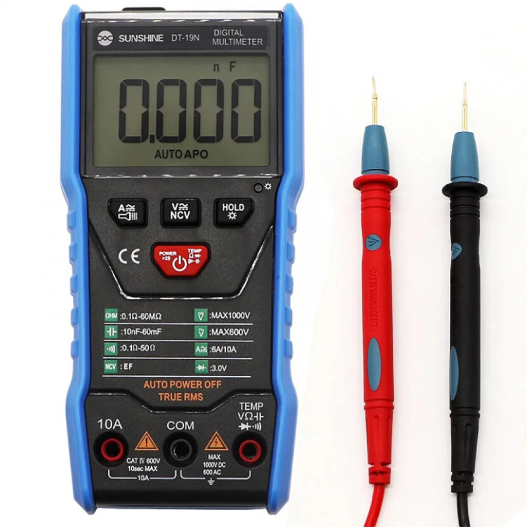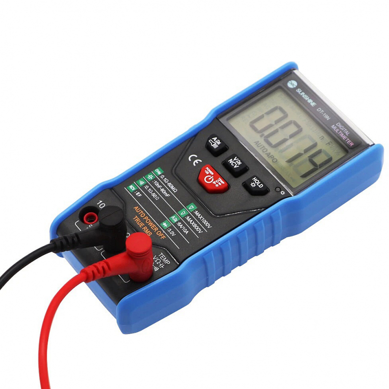 Sunshine DT-19N Digitális multiméter. Az első multiméter, amelyet kifejezetten mobiltelefon javításhoz terveztek. Áramerősség mérése: AC6A/DC10A. Feszültség mérése: AC600V/DC1000V. Méretek: 84x90x46mm. Méréstartomány hőmérséklet: 20-1000 fok. Jellemző: automatikus azonosítás. Mintavételi ráta: 3 alkalom/másodperc. Módszer: dupla integrál A/D átalakítás.