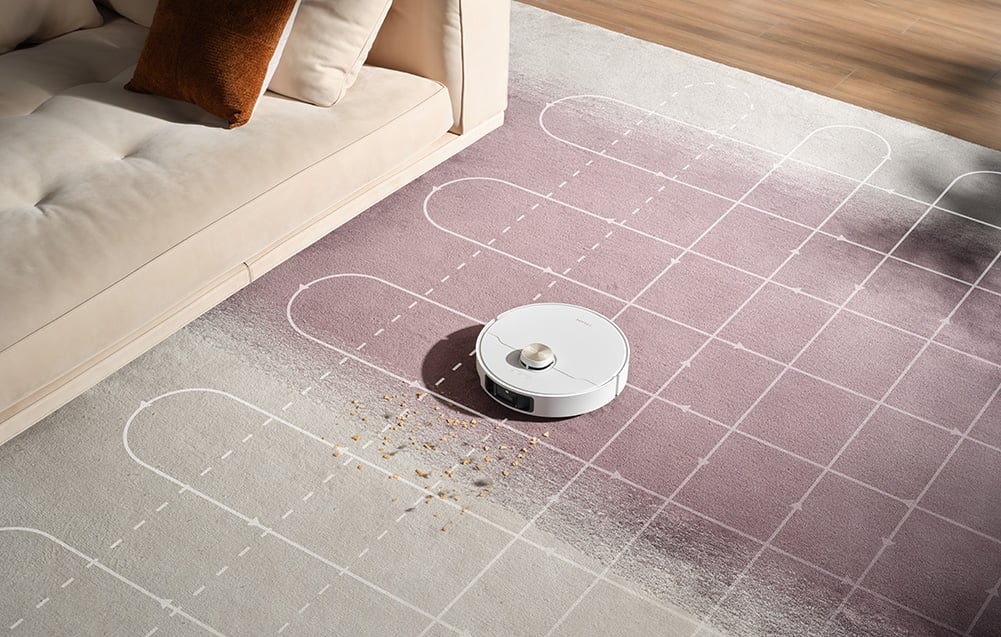 A robotporszívó nemcsak azt ismeri fel, hogy mi van a padlón, hanem azt is, milyen felülettel van dolga. Különbséget tesz hosszú és rövid szálú szőnyegek, jógaszőnyegek, fürdőszobai szőnyegek és kemény padlók között. A Smart Dirt Detection 2.0 rendszer érzékeli, hogy száraz vagy folyékony szennyeződésről van szó, és ennek megfelelően választja ki az optimális tisztítási módot. A TripleUp technológia lehetővé teszi a felmosópárnák, a főkefe és az oldalkefe független vezérlését. Szőnyeg érzékelésekor automatikusan felemeli a felmosópárnákat 10,5 mm-re, hogy elkerülje a nedvesedést, vagy intenzívebb tisztítási módot kapcsol be. A 4 cm-re kihúzható oldalsó kefe és felmosóbetétek biztosítják a falak menti és sarkok tökéletes tisztaságát (ahogy a robot mozgása is mutatja a képeken). Az EasyLeap™ rendszerrel akár 40 mm magas akadályokat (pl. küszöböket, burkolatváltókat) is képes leküzdeni, a 4 kerekes kialakítás pedig nedves felületeken is kiváló tapadást biztosít.