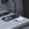 - Két port egyidejű töltéshez: Az egy USB-C (PD) és egy USB-A (QC) port lehetővé teszi két eszköz – például okostelefon és tablet – egyidejű töltését a töltési stabilitás megőrzése mellett. Az USB-A port jellegzetes sárga belső kialakítása modern megjelenést kölcsönöz, míg az USB-C port diszkréten fehér belsejű.