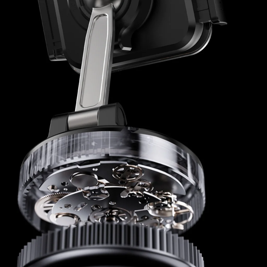 - Precíz mechanikai zárrendszer: A tartó belső mechanizmusa egy kifinomult, robusztus zárszerkezetet rejt (ahogy az részletes képeken is látható), amely megbízhatóan tartja a telefont. Ez a precíz kialakítás hatékonyan minimalizálja a rezgéseket és a telefon elmozdulását hirtelen fékezés, kanyarodás vagy egyenetlen útfelület esetén. Az oldalsó "Press Here" gomb egyszerű és gyors kioldást biztosít.