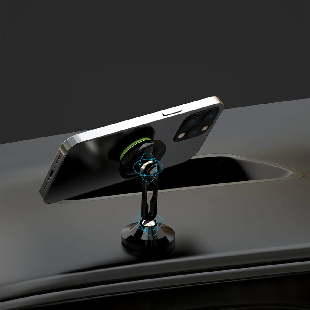 Mágneses autós tartó az autó műszerfalára szerelhető. A kütyü rendkívül egyszerűen használható, csak tedd rá a telefont, és az erős mágnesek azonnal magához vonzzák. Nagy állítási lehetőségekkel (többek között 360 fokos elforgatással) és gumiborításokkal rendelkezik, amelyeknek köszönhetően nem fogjuk karcolni a légáramlást. A töltőre csatlakoztatott telefont nyugodtan ráteheted, semmi sem zavarja.