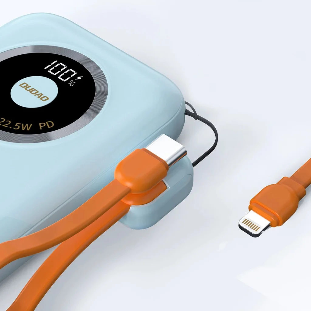 A Dudao K21 Mini Powerbank egy kompakt és rendkívül hatékony eszköz, amely megbízható energiaforrást biztosít minden helyzetben. 10000mAh kapacitással és 22.5W maximális teljesítménnyel gyorsan és egyszerűen feltöltheted eszközeidet. A Power Delivery és PPS protokollok támogatása lehetővé teszi a töltési teljesítmény intelligens beállítását, növelve a hatékonyságot és a biztonságot. A powerbank két kimeneti porttal rendelkezik: USB-A és USB-C, amelyek lehetővé teszik több eszköz egyidejű töltését. Emellett a beépített kábeles innovatív pánt azt jelenti, hogy mindig rendelkezésre áll a szükséges töltési kiegészítő.