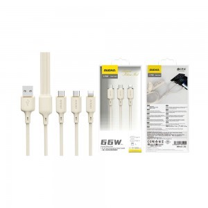Három eszköz egyidejű töltése A Dudao L7SE kábel három különböző csatlakozóval van felszerelve, így egyszerre több eszközt is tölthet, ami rendkívül praktikus és kényelmes. Töltési teljesítmény legfeljebb 66W A gyors töltés támogatása lehetővé teszi a telefon, tablet vagy laptop energiaellátásának gyors feltöltését, így időt takarít meg. Fejlett védelem A beépített biztonsági mechanizmusok védik a készülékeket a túlmelegedés, túlterhelés és egyéb veszélyek ellen. Tartós és rugalmas kialakítás A kábel magas minőségű anyagok felhasználásával készült, így ellenáll a mindennapi használatnak, a csavarodásnak és a mechanikai sérüléseknek. Elegáns dizájn A modern, bézs szín és a stílusos megjelenés miatt a kábel bármilyen helyzetben nagyszerűen néz ki.