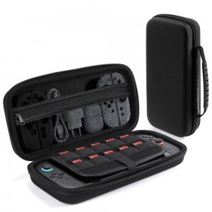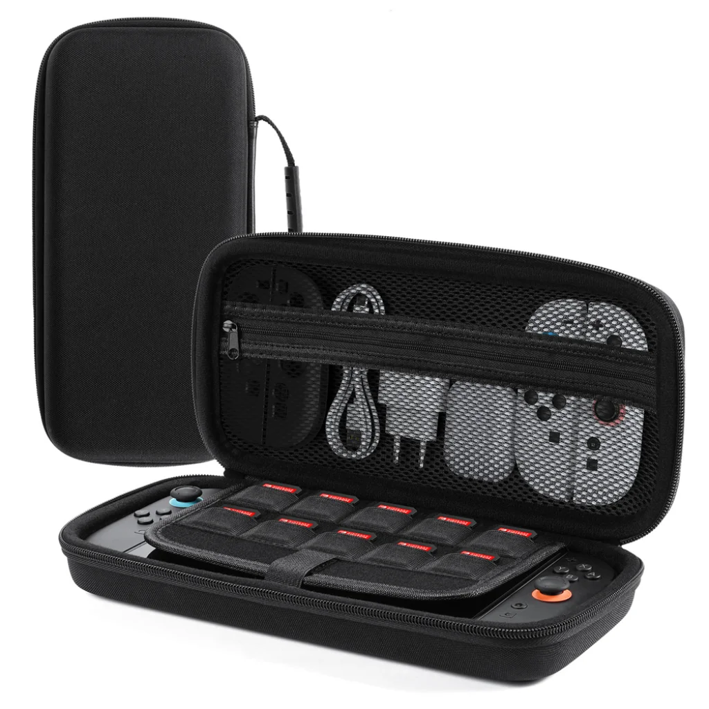 Védje a konzolt a véletlen leesésektől és nyomástól a tartós EVA konstrukcióval, amely biztosítja a biztonságos szállítást. A fröccsenésálló Oxford anyag védi a nedvességtől és szennyeződésektől. Egyszerűen törölje le a felületet, hogy visszaállítsa a tok tiszta megjelenését. A beépített rekeszekkel ellátott bársony panel lehetővé teszi akár 12 játékkártya tárolását, megvédve a konzol képernyőjét a karcolásoktól. A tok minden szükséges kiegészítőt – töltőtől, kábelektől a tartókig és kontrollerekig – rendezetten és gyorsan hozzáférhetően tart. A fogantyú és a karcsú kialakítás megkönnyíti a tok utazás közbeni szállítását és kényelmes tárolását otthon, az irodában vagy hátizsákban.