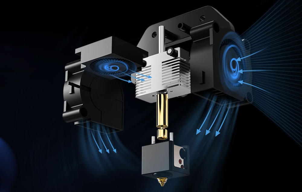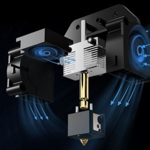 Továbbfejlesztett hotend és extruder: A nagy teljesítményű, kettős fogaskerék-elosztású, direkt típusú extruder precíz és stabil filament adagolást biztosít, míg a továbbfejlesztett hotend réz-titán hőcsövet és 300°C-os fúvókát alkalmaz.