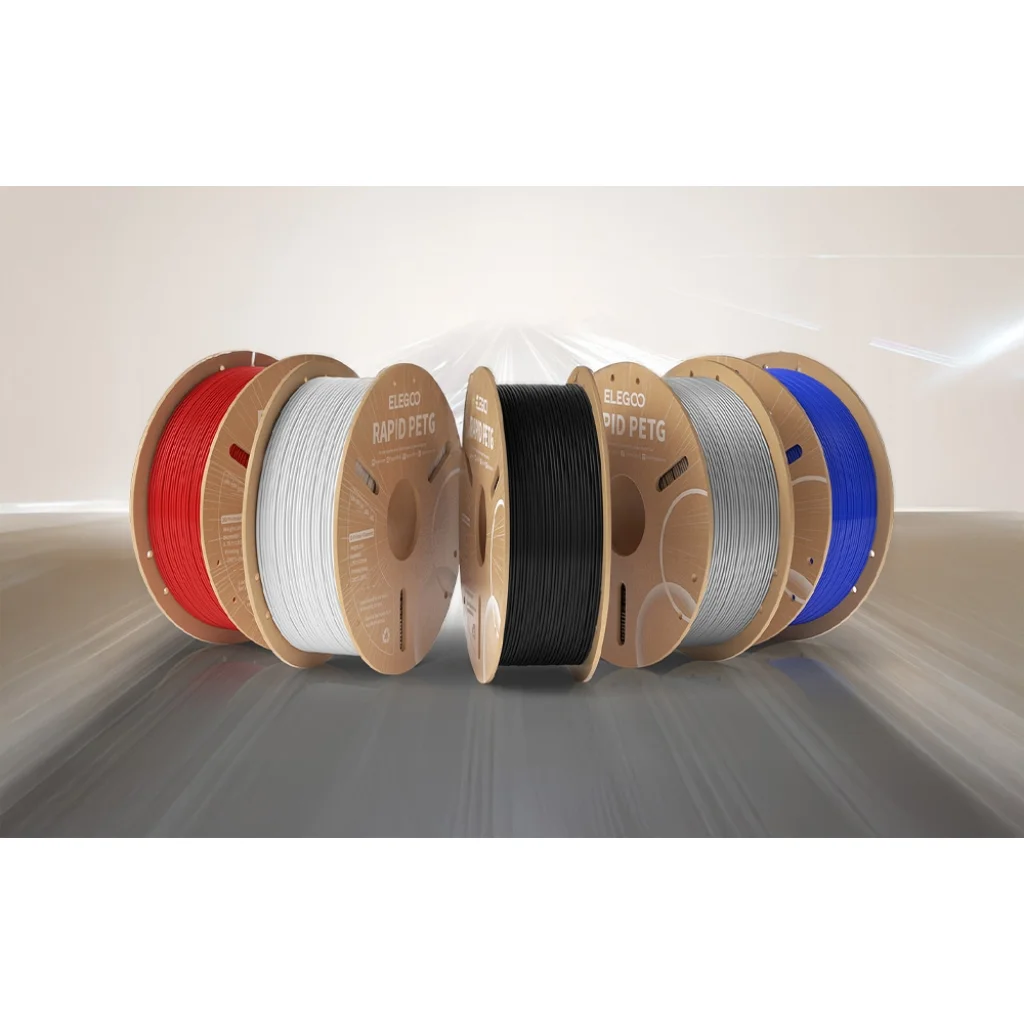 Az ELEGOO Rapid PETG (polietilén-tereftalát - nagy sebességű nyomtatáshoz módosított, hosszú élettartamú műanyag) fekete színű filamentet akár 600 mm/s sebességű nyomtatásra tervezték - a minőség romlása nélkül. Jó folyékonyságának és alacsony zsugorodásra való hajlamának köszönhetően az anyag esztétikusan szép modelleket készít, még igényes projektek esetén is vetemedés nélkül.