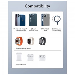 - iPhone: MagSafe-kompatibilis modellek (iPhone 12 széria és újabb), hivatalos Apple MagSafe tokok, ESR HaloLock tokok, valamint az ESR HaloLock Univerzális Gyűrűvel ellátott tokok.
