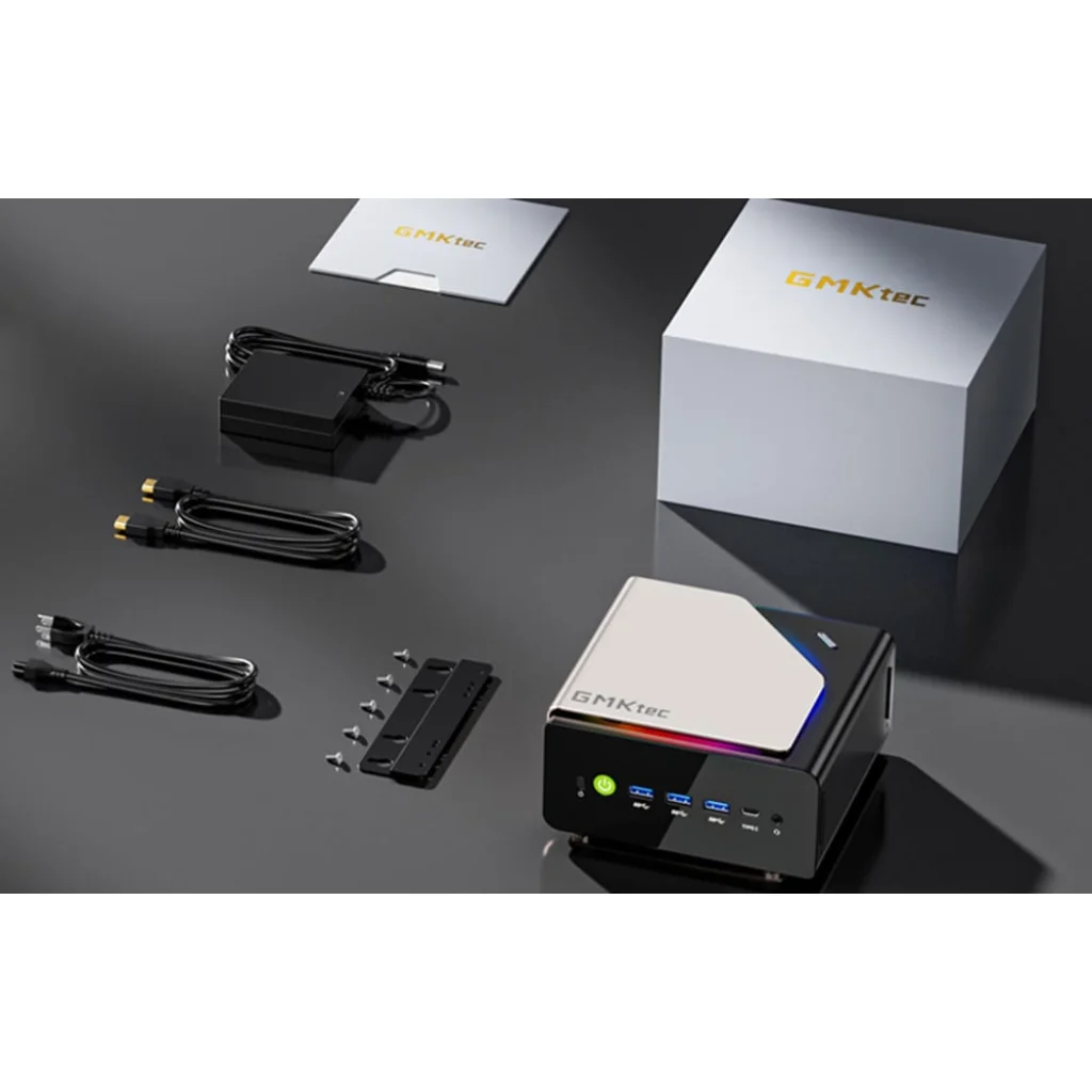 Mini PC GMKtec egy sötét asztalon fekszik a készlet tartalmával.