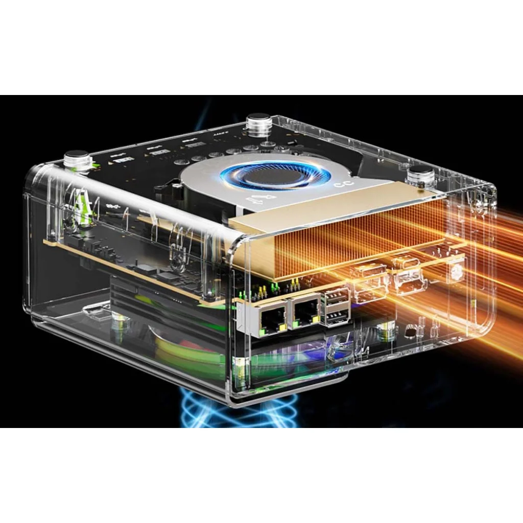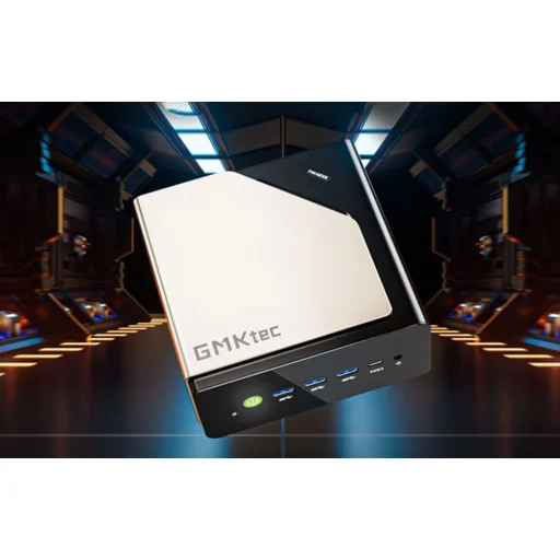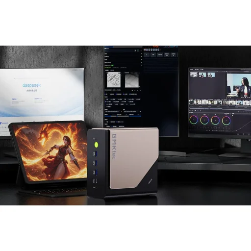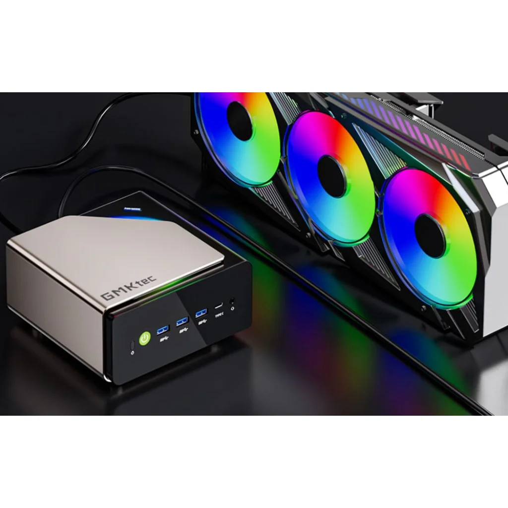 GMKtec mini PC fekszik egy fekete asztalon. Mellette 3 színes ventilátor.