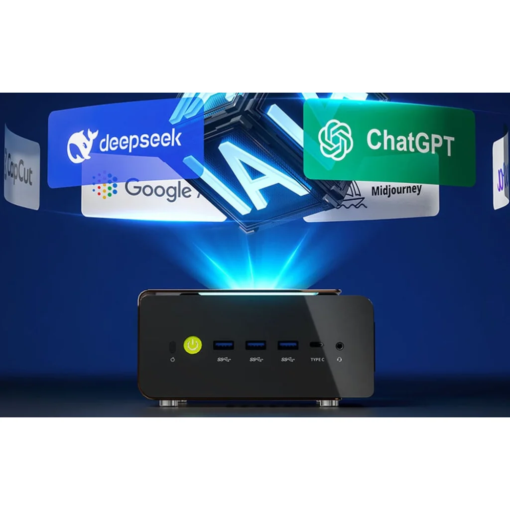 Mini PC fekete asztalon. A tetején ChatGPT, Google, Midjourney, Deepdesk felirat.