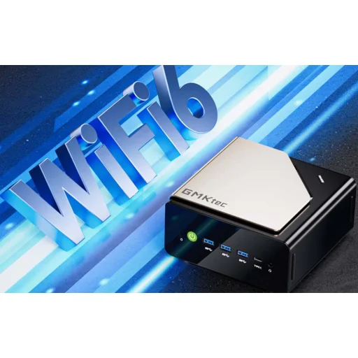 Mini PC GMKtec, kék felirat mellett WiFi 6.