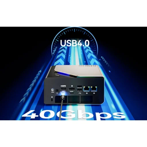 A mini PC lehetővé teszi négy képernyő egyidejű csatlakoztatását akár 8K felbontásban, 60 Hz-en. Rendelkezésedre áll egy HDMI 2.1 port CEC-támogatással, egy DisplayPort 1.4 és két USB4.0 csatlakozó a tápellátáshoz, valamint a videó- és adatátvitelhez. Ez a konfiguráció megkönnyíti a munkát a fejlett grafikai és szerkesztési projektekkel, és javítja a felhasználói élményt a mindennapi feladatoknál.