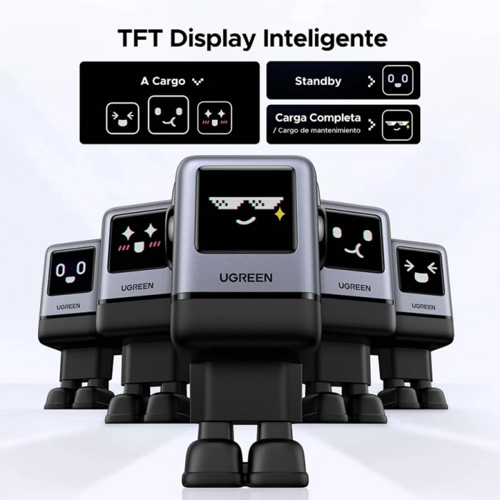 A UGREEN X688 Uno kiemelkedik a tömegből kreatív robot formájával, amelyet egy lenyűgöző TFT képernyő tesz teljessé. Ez a kijelző nem csak esztétikai elem, hanem dinamikus arckifejezéseket jelenít meg a töltési állapot alapján (töltés, készenlét, teljes töltöttség), személyiséget és szórakozást adva a használathoz. A töltő mágneses lábai lehetővé teszik a könnyű és stabil rögzítést a laptophoz, megakadályozva, hogy elveszítsd vagy elfelejtsd magaddal vinni.