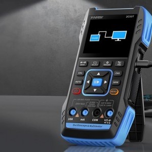 Az FNIRSI 2C53T egyesíti a 2×50 MHz/250 MSa/s oszcilloszkóp funkcióit 8 bites ADC-vel és csatornánként 16 kpct memóriapufferrel (pre/post-trigger), 19999 számláló multiméterrel és 50 kHz-es jelgenerátorral. A bemeneti impedancia 1 MΩ ∥ 15 pF AC/DC/GND kapcsolással. A robusztus ABS ház szilikon borítással, a 2,8 hüvelykes 320×240 px képernyő és a 3000 mAh-s akkumulátor (akár 4 órás üzemidő) garantálja a mobilitást és a folyamatos méréseket még zord környezetben is. A készülék CAT II 300 V-os tanúsítvánnyal, kettős kerámia biztosítékkal és égésgátló áramkörrel rendelkezik. A hullámformák mentésének és a firmware frissítésének lehetőségével mindig kézben tarthatja eredményeit, és hozzáférhet a legújabb funkciókhoz.