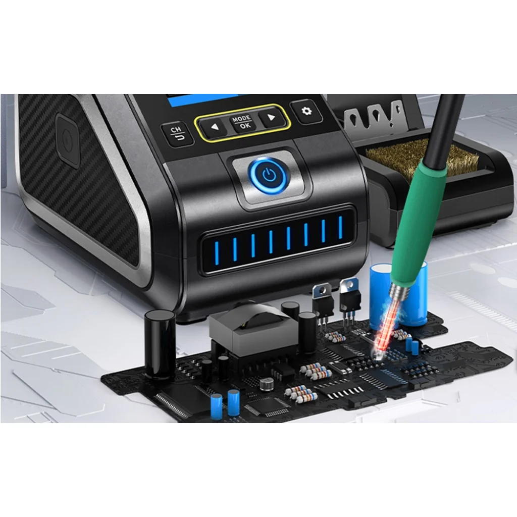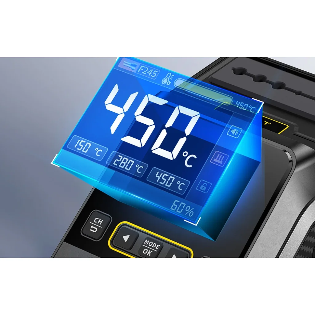 Széles körű kompatibilitás és teljesítménystabilitás Az állomás támogatja az F210 és F245 tartókat is - könnyedén válthat közöttük az adott munkától függően. A széles feszültségtartománynak (100-240V) és a tiszta réz transzformátornak köszönhetően az egység stabilan működik a legkülönbözőbb áramellátási körülmények között, így ideális választás a felhasználók számára világszerte. Az intelligens PID-rendszer stabil hőmérséklet-szabályozást tesz lehetővé 100°C és 450°C között. Az állomás gyors fűtési (mindössze 1 másodperc) és olvadási (3 másodperc) idővel is rendelkezik, emellett akár 200 W-os teljesítményt kínál a még pontosabb működés érdekében.