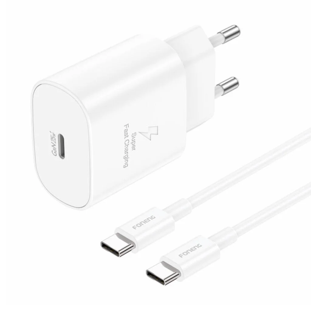A Foneng EU51 USB-C 25W hálózati töltő és USB-C - USB-C kábel hatékony és sokoldalú megoldás azok számára, akik gyors töltést igényelnek. A GaN (gallium-nitrid) technológiával akár 25W teljesítményt biztosít, így akár 60%-ra is fel tudja tölteni a telefont mindössze 30 perc alatt. Többféle gyors töltési protokollt támogat, köztük a Samsung PPS, FCP, SCP, AFC, DCP, QC2.0/3.0/4.0 és PD3.0, ezáltal a különböző eszközökkel, beleértve az IP8-tól IP15-ig terjedő okostelefonokat, kompatibilis. A töltő három különböző típusú csatlakozóval (EU/UK/US) rendelkezik, így ideális világ utazásokhoz. Az fejlett GaN chip állandó hőmérsékletet tart fent, biztosítva a biztonságos töltést még intenzív használat mellett is. Emellett beépített védelmi funkciók is vannak, melyek védenek a túlfeszültség, túlmelegedés és túlterhelés ellen. A csomag tartalmaz egy gyorstöltő kábelt is, amely tovább gyorsítja a töltési folyamatot.