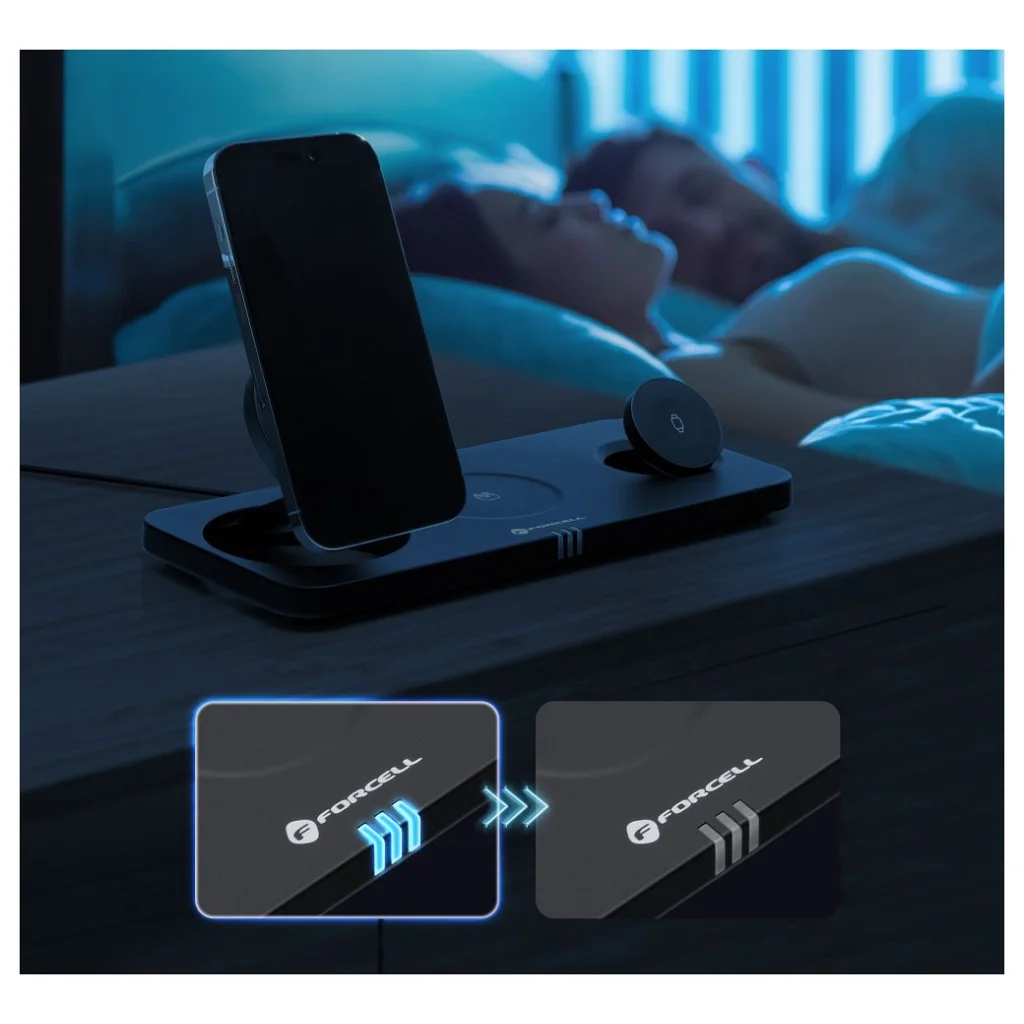 A Forcell F-Energy MagNetix 20,5 W 3 az 1-ben vezeték nélküli töltő egy sokoldalú eszköz, amely támogatja a legújabb Qi2 szabványt, lehetővé téve akár három eszköz gyors és biztonságos töltését egyszerre, anélkül, hogy teljesítményveszteség lenne. MagSafe® kompatibilitása miatt kiváló választás Apple felhasználók számára.