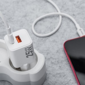 A Forcell Mini GaN III fali töltő nagy hatékonyságot nyújt minimális méretben. Támogatja a Power Delivery (PD) és a Quick Charge 4.0 (QC 4.0) gyorstöltést okostelefonok, tabletek és egyéb eszközök számára. Egy USB-C és egy USB-A porttal van felszerelve, így két eszközt is tölthetsz egyszerre. GaN III technológia: GaN Generation III az új technológia evolúciójának következő lépése. A GaN töltők még kisebbek, energiahatékonyabbak és erősebbek. Kompatibilisek a modern töltési szabványokkal. Kicsi és praktikus: Kicsi méretének (7,5 cm x 3 cm) köszönhetően a töltő könnyen tárolható és szállítható. Kiválóan működik otthon és útközben is. Gyors töltés QC 4.0-val: A Forcell Mini GaN III támogatja a legújabb gyorstöltési protokollokat, beleértve a Quick Charge 4.0-t és a Power Delivery-t. Ennek eredményeként lehetővé teszi eszközeid gyors és biztonságos töltését, minimálisra csökkentve a várakozási időt. Univerzális: A töltő kompatibilis a különféle elektronikus eszközökkel. CE és RoHS tanúsítvánnyal rendelkezik, a beépített védelemek pedig megakadályozzák a túlmelegedést, a túltöltést és a feszültségcsúcsokat. Specifikáció: Modell: VT-25B Bemenet: 100-240 V~50/60 Hz, 0,8 A (max). USB-C kimenet: 5 V/3 A, 9 V/2,22 A, 12 V/2,08 A USB-A kimenet: 5 V/3 A, 9 V/2 A, 12 V/1,5 A USB-C + USB-A kimenet: 5 V/3 A Teljes kimeneti teljesítmény: 25 W (max)