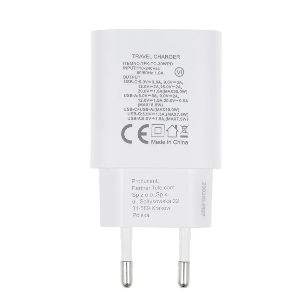 Fedezze fel a modern és hatékony töltés élményét a FORCELL F-ENERGY TFK-TC-30WPD utazó töltővel Type C + USB A PD QC4.0 3A 30W fehér színben! Ez a kompakt és stílusos fali adapter két portjának (USB-C és USB-A) köszönhetően maximális rugalmasságot biztosít eszközeinek töltéséhez, akár 30W teljesítménnyel. Tökéletes választás otthonra, irodába és utazáshoz egyaránt, hiszen támogatja a Power Delivery (PD) és Quick Charge (QC4.0) technológiákat a villámgyors energiaellátásért.