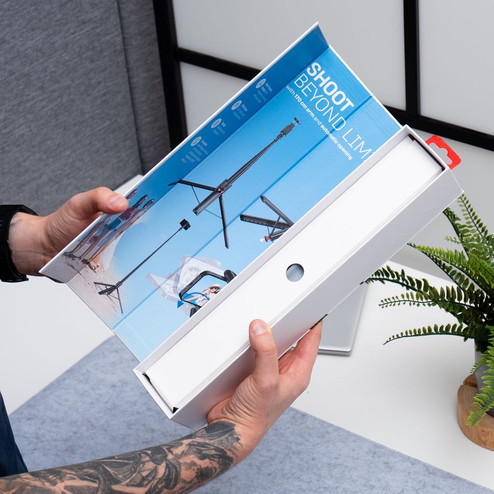 Az F-Grip F170XL selfie bot egy modern eszköz automatikus kihajtási funkcióval, amely kényelmes állvánnyá alakul, ideális széles felvételek, teljes testet ábrázoló fotók, videofelvételek és egyéb célokra. Lenyűgöző, 177 cm hosszú karjával a selfie bot ideális több ember megörökítésére vagy dinamikus, kreatív felvételek készítésére.