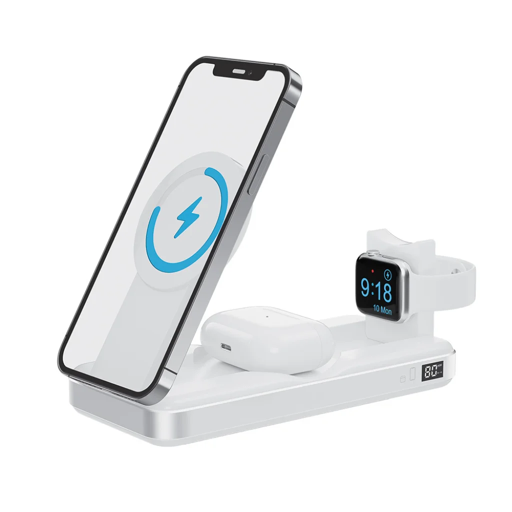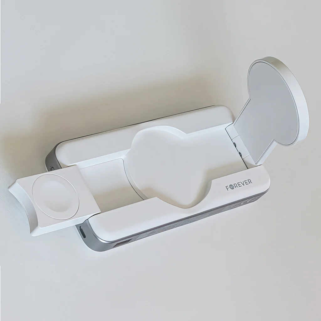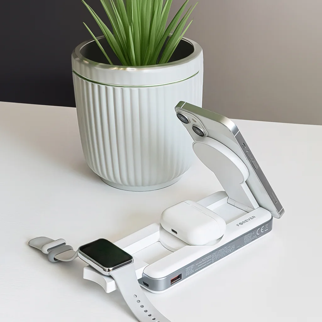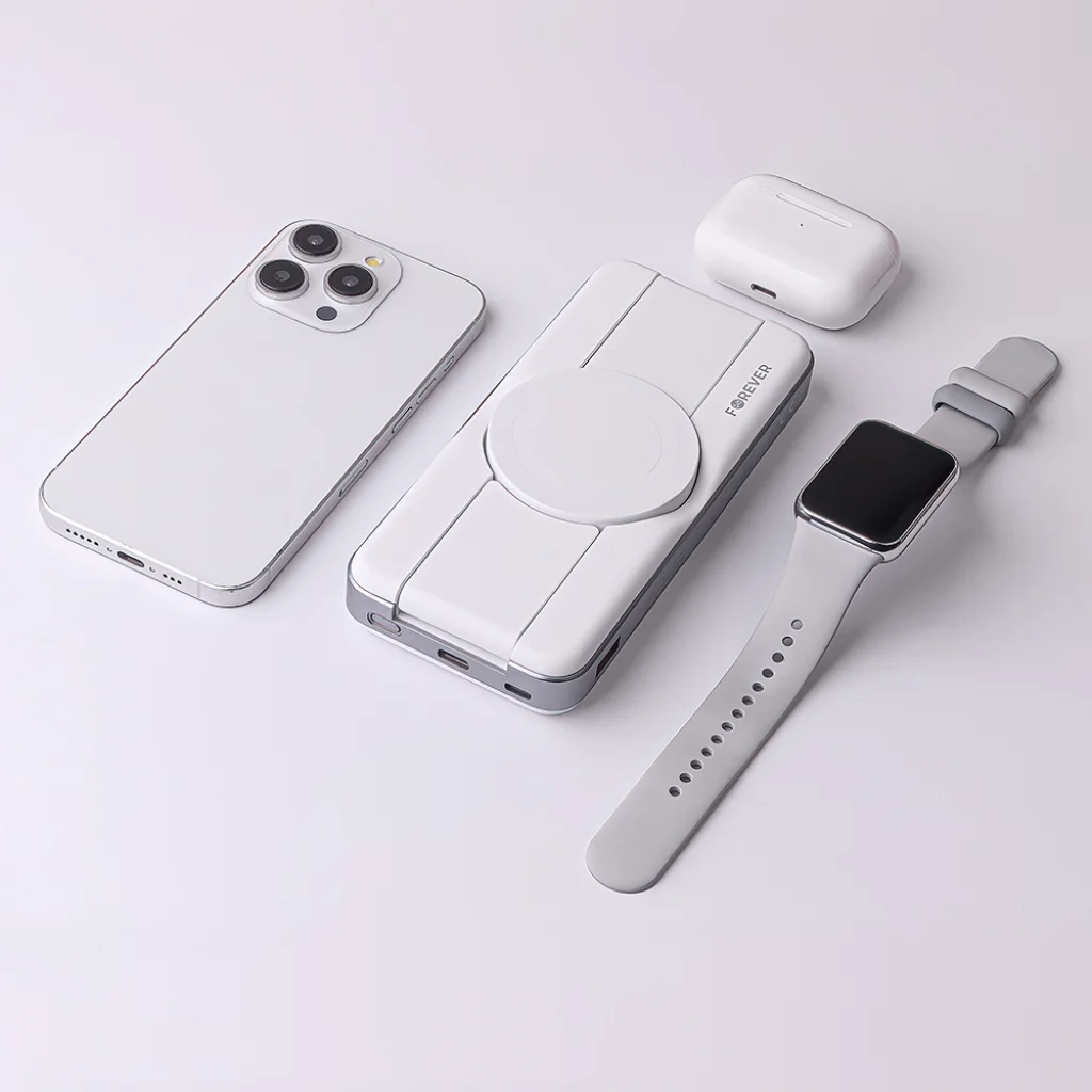 A Forever vezeték nélküli power bank MATB-300 10 000mAh kapacitással lehetővé teszi három eszköz egyidejű töltését: egy telefont, AirPods-t és Apple Watch-ot.