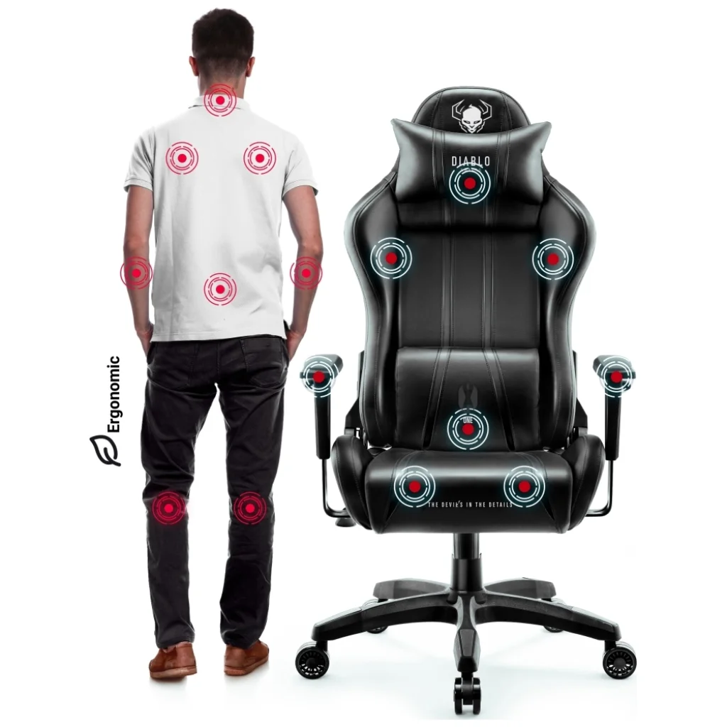 A Diablo Chairs X-One 2.0 Normál méretű gamer szék elegáns fekete-szürke verzióban kifejezetten azoknak a játékosoknak és felhasználóknak készült, akik hosszú órákat töltenek íróasztalnál. A dinamikus formatervezés és a magas funkcionalitás kombinációja tökéletessé teszi a széket mind intenzív játékhoz, mind mindennapi munkavégzéshez vagy tanuláshoz.
