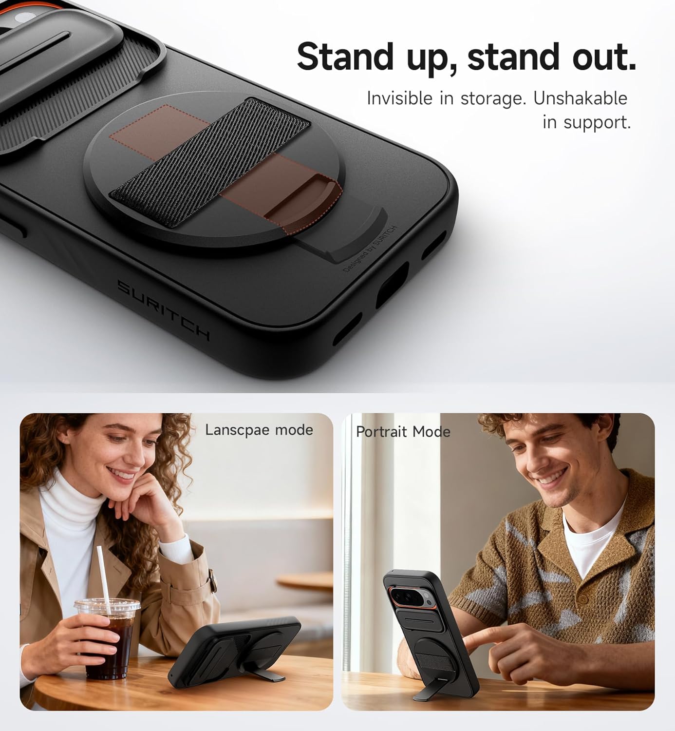 A forgatható gyűrű nemcsak markolatként funkcionál, hanem rejtett kitámasztóként is szolgál. Tároláskor észrevétlen, de stabilan megtartja telefonját vízszintes (fekvő) és függőleges (álló) módban is, így kényelmesen nézhet videókat, intézhet videóhívásokat vagy böngészhet anélkül, hogy kézben kellene tartania készülékét.
