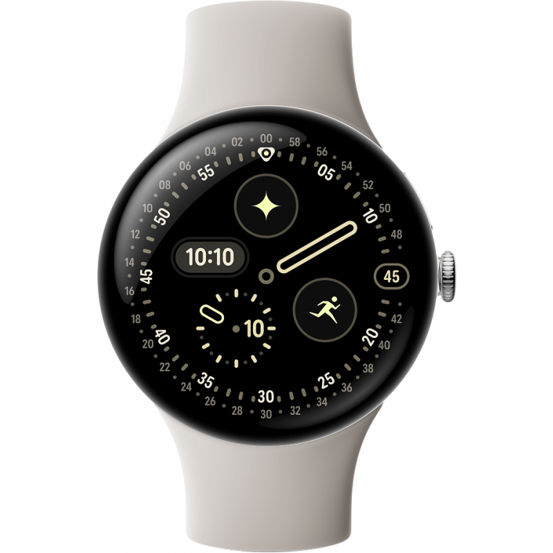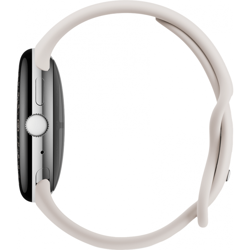 A Google Pixel Watch 4 letisztult és minimalista esztétikája azonnal magával ragad. A 45 mm-es, gondosan megmunkált, polírozott ezüst rozsdamentes acél tok, a lágyan ívelt, domború üveg és a porcelán színű, puha tapintású szilikon szíj együttesen biztosítják a prémium megjelenést és a kivételes viselési kényelmet. A diszkréten elhelyezett forgatható korona és oldalsó gomb intuitív vezérlést tesz lehetővé, míg a szabadalmaztatott szíjmechanizmus garantálja a zökkenőmentes illeszkedést és a könnyed cserélhetőséget.