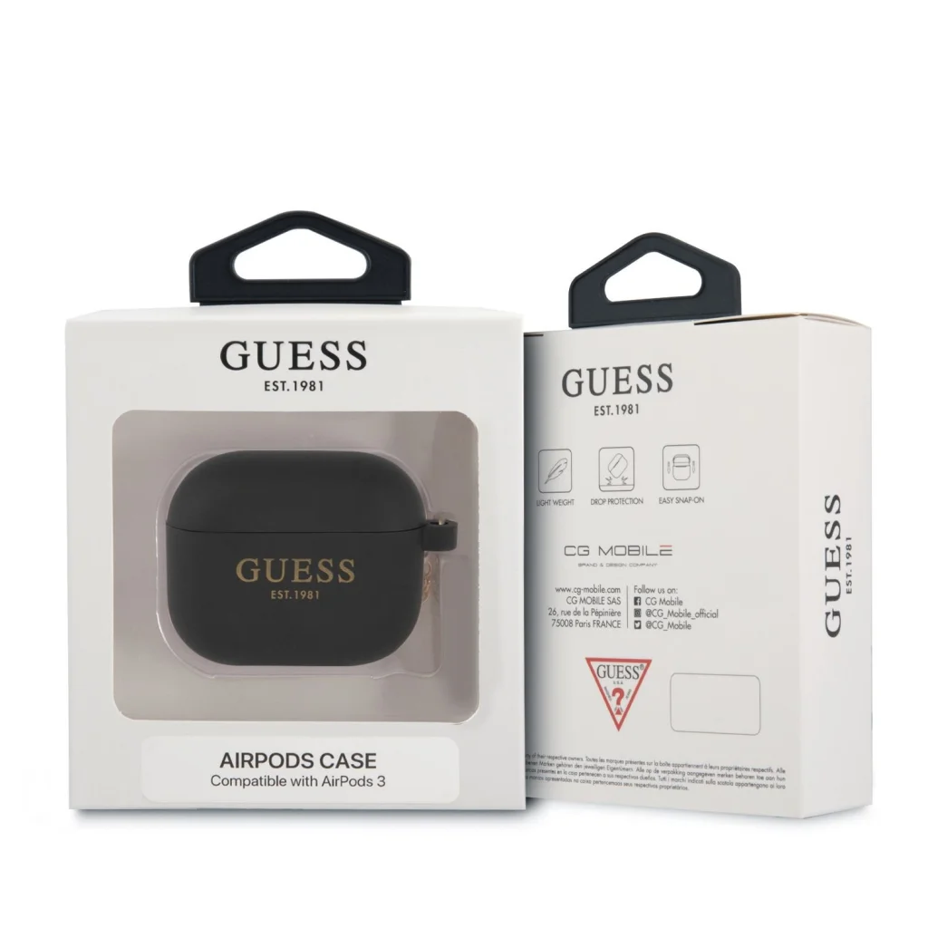Guess márkájú tok AirPods fejhallgatókhoz, stílusos kialakítással, kiváló minőségű szilikonból és kiváló kidolgozással.