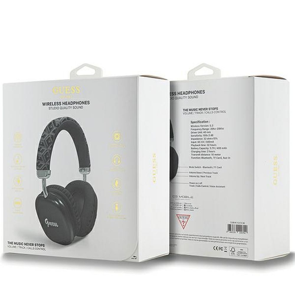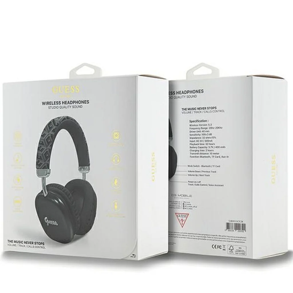 A fejhallgatók a legmagasabb minőségű GCube nyomtatással vannak díszítve, amely a neves Guess divatház számos projektjéből ismert. A GCube nyomat a kiváló minőségű ökológiai bőr textúráján fényt és szépséget kölcsönöz az egész struktúrának, felhívja a figyelmet a termékre, és rendkívül luxussá teszi. A fejhallgató kidolgozása rendkívül kifinomult, ami egyedülállóan esztétikus megjelenést eredményez. A fülkagyló külső része kiváló minőségű műanyaggal van bevonva, ami csodálatosan kontrasztál a GCube nyomattal, és felületén egy nagy, vintage stílusú Guess logo található. A Guess logo igazolja a termék legmagasabb minőségét és eredetiségét. A termék a Guess licence alapján készült.