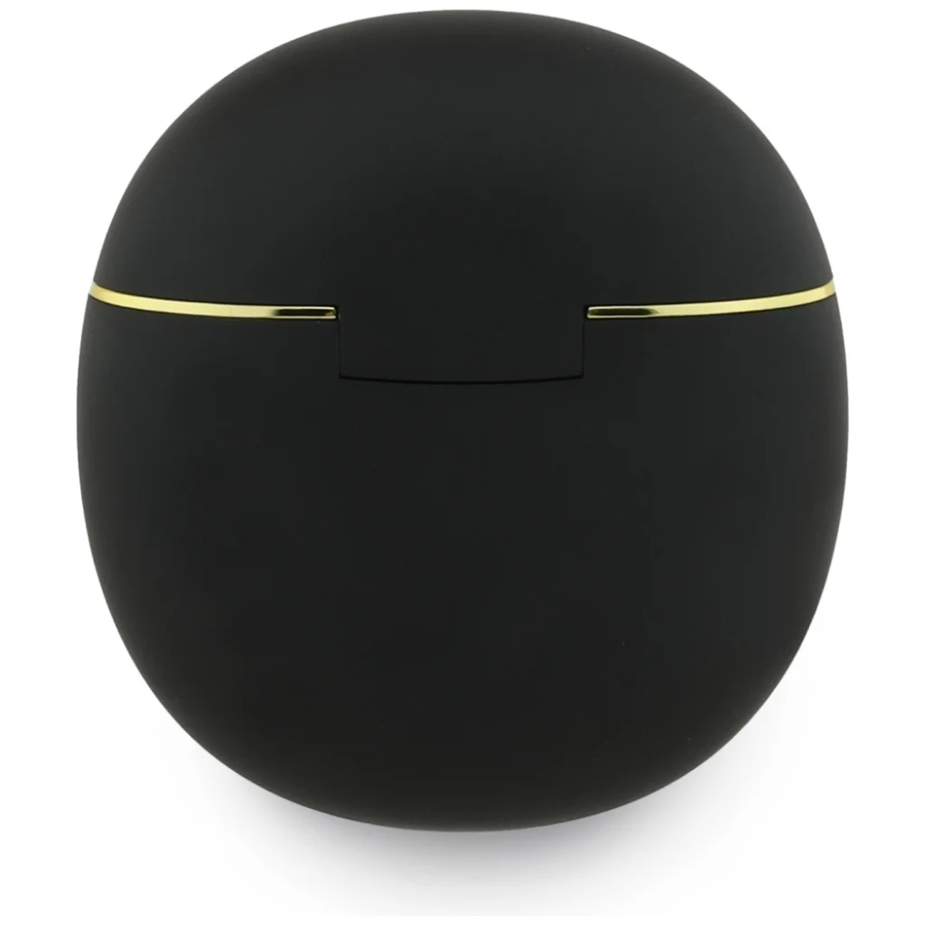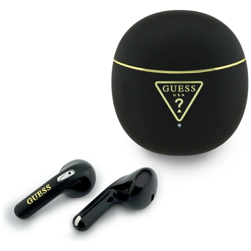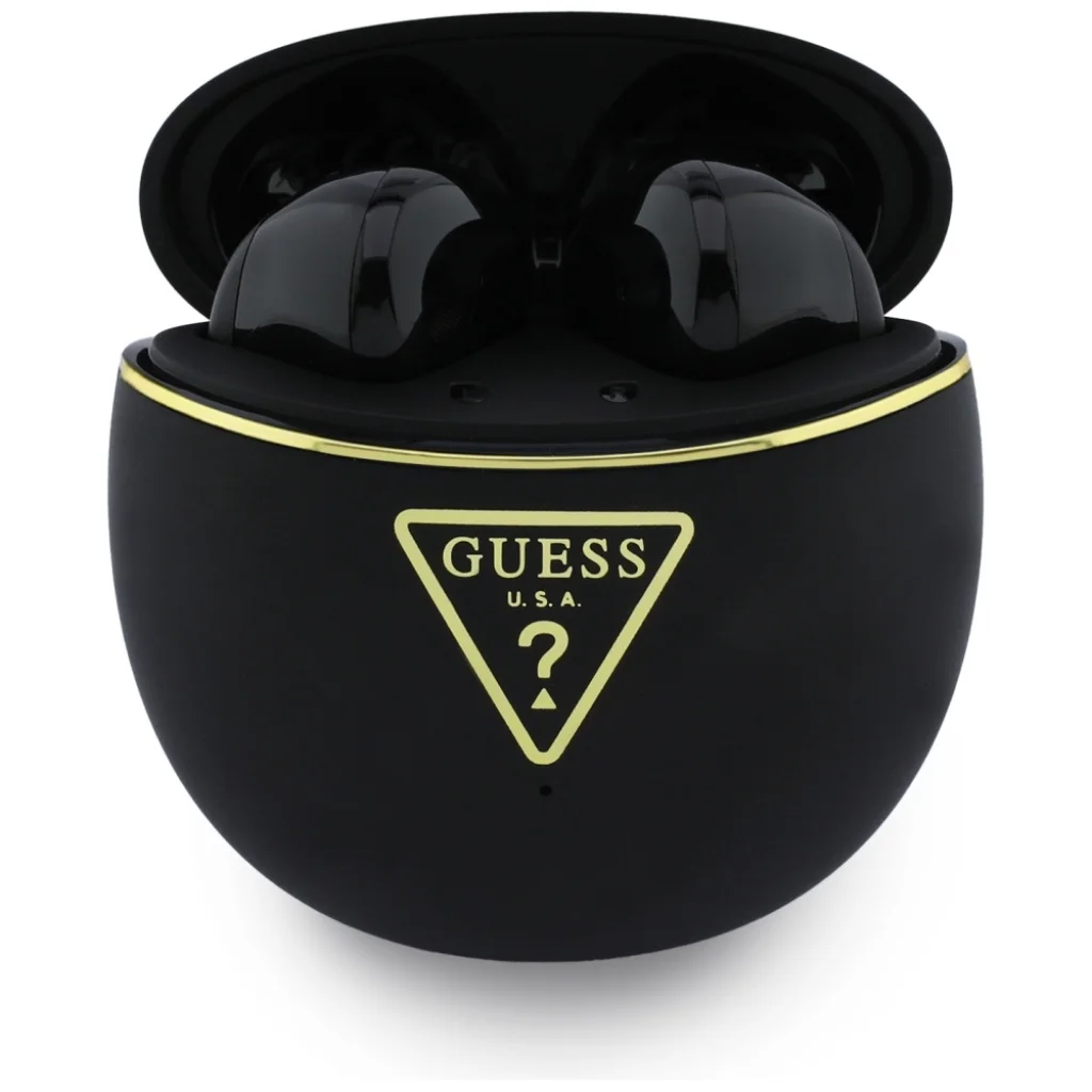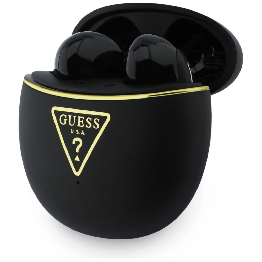 A fekete színű fülhallgató különleges és minimalista megjelenést kölcsönöz. A tokon található arany Guess logó luxus megjelenést biztosít.