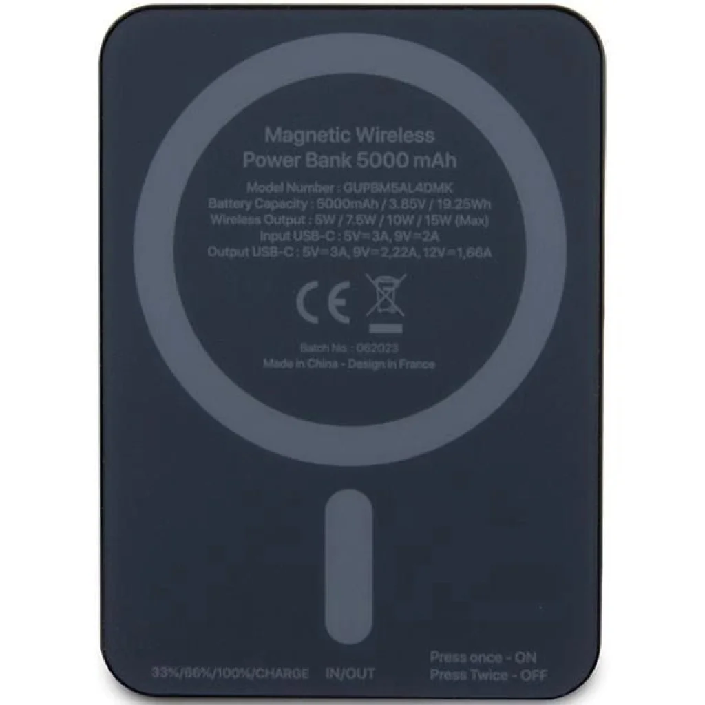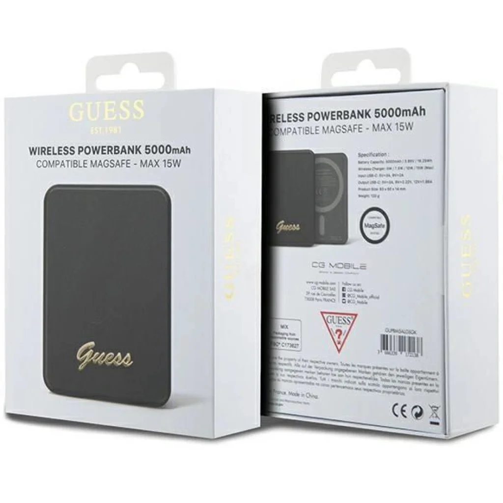 Az eszköz USB-C porttal van felszerelve, amely kiszolgálja mind a készülékek töltését, mind a powerbank töltését. A csomag tartalmaz egy USB-C kábelt, amely lehetővé teszi mind a telefon, mind a powerbank töltését. A termék a Guess márka engedélyével készült.