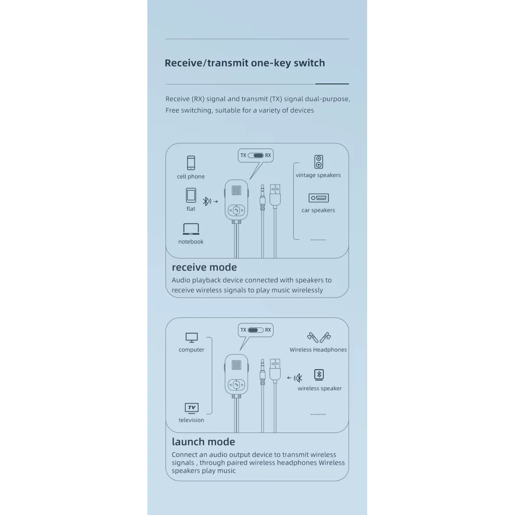 Adás módban az adapter egy vezetékes forrásból (pl. TV, számítógép, projektor) származó hangot alakít át Bluetooth jellé, amelyet vezeték nélküli fejhallgatók vagy hangszórók fogadhatnak. Használja, ha: