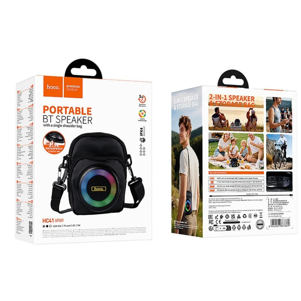 A Hoco HC41 Bluetooth hangszóró egyedülálló kombinációja egy hordozható hangszórónak és egy praktikus 1,5 literes táskának. A kompakt kialakítás, 8W teljesítmény és Bluetooth 5.4 csatlakozás tökéletessé teszi szabadtéri tevékenységekhez, sétákhoz és mindennapi tevékenységekhez. A Hoco HC41 azok számára készült, akik szeretnék, ha a zene mindig velük lenne. A táska-szerű dizájn lehetővé teszi, hogy kényelmesen vigyél magaddal kisebb tárgyakat, miközben élvezed a hangzást anélkül, hogy további felszerelést kellene vinni. A könnyű és kompakt kialakítás tökéletes utazásokhoz, piknikekhez vagy sétákhoz. A beépített 52 mm-es hangszóró 8W teljesítménnyel tiszta, dinamikus hangzást biztosít, ami ideális zenehallgatáshoz, rádiózáshoz vagy podcastok hallgatásához. A modern Bluetooth 5.4 modulnak köszönhetően a kapcsolat az okostelefonoddal stabil és energiatakarékos. A Hoco HC41 hangszóró több lejátszási módot támogat – Bluetooth, FM rádió, TF kártyák, USB meghajtók, és vezetékes mikrofon, így sokoldalú eszközként használható különböző alkalmazásokhoz. Az 2500 mAh akkumulátor körülbelül 3 órás üzemidőt biztosít, és a teljes feltöltés kb. 2,5 órát vesz igénybe.