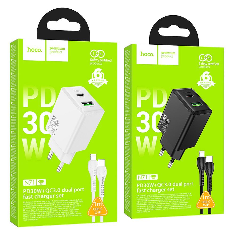 Hoco N71 hálózati töltő, gyors töltési funkcióval és kettős kimenettel. Lehetővé teszi a mobil eszközök gyors feltöltését. A csomag tartalmaz egy 1 méteres USB-C - USB-C kábelt. A töltő két kimenettel van felszerelve: USB-C (30 W) és USB-A (18 W), így két eszközt is tölthet egyszerre. A termék támogatja a gyors töltési megoldásokat, például a PD, QC 3.0, FCP, AFC és egyebek. A PC-ből készült töltő rendkívül tartós és ellenálló a sérülésekkel szemben. Az intelligens felismerés lehetővé teszi, hogy az áramot az adott eszközhöz igazítsa, biztonságos használatot biztosítva. A töltőhöz egy 60 W teljesítményű USB-C - USB-C kábel is tartozik, 1 méter hosszúságban. Specifikáció: