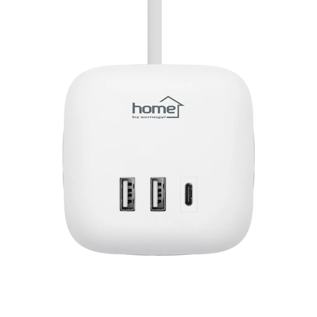 A CUBE2 kocka elosztó különlegessége a beépített USB töltő: 1 db USB-C és 2 db USB-A töltőaljzat, melyek maximális teljesítménye 12 W. Ez azt jelenti, hogy egyszerre akár három USB-s eszközt is tölthet, például okostelefont, táblagépet vagy hordozható akkumulátort. A kocka elosztó 1,5 méter hosszú, masszív H05VV-F 3G1,0 mm-es vezetéke elegendő távolságot biztosít a kényelmes elhelyezéshez, így akár az íróasztalnál, akár a nappaliban vagy a hálószobában is könnyedén használható.