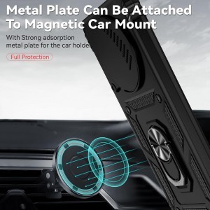 A tok hátoldalán található beépített fém gyűrűtartó rendkívül sokoldalú. Nem csupán kényelmes és biztonságos fogást biztosít, csökkentve az elejtés kockázatát, de kitámasztóként is funkcionál, ideális szögben tartva a telefont videónézéshez vagy videóhívásokhoz. A gyűrű 360 fokban elforgatható és 100 fokban kihajtható, így bármilyen pozícióban kényelmesen használható. Emellett a beépített fémlemeznek köszönhetően a tok könnyedén rögzíthető mágneses autós tartókhoz is, ami nagyban megkönnyíti a navigáció és a hands-free hívások használatát vezetés közben.
