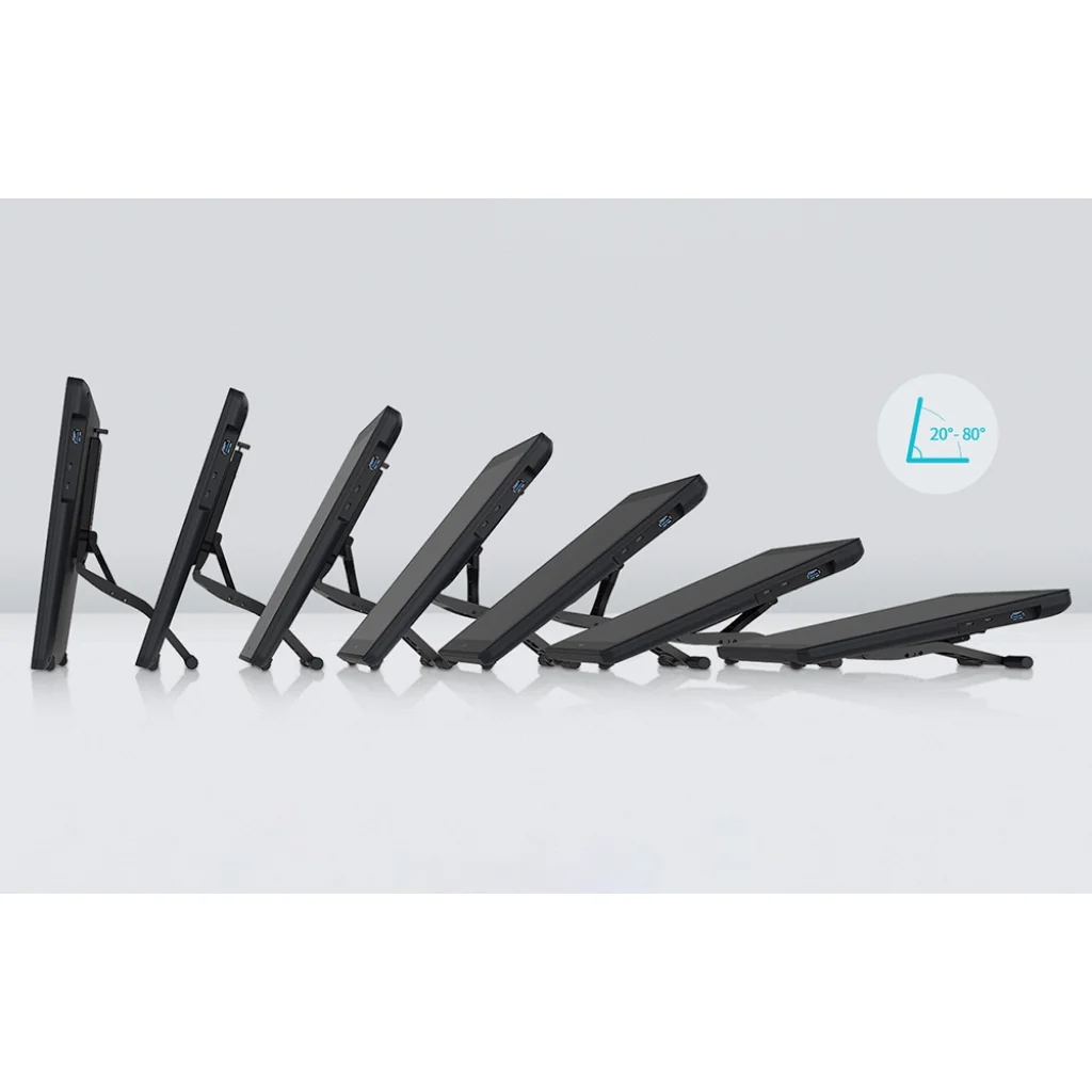 Az állítható fémállvány lehetővé teszi a képernyő 20° és 80° közötti dőlésszögének beállítását. Így kényelmesen beállíthatja testhelyzetét, és munka közben kényelmesen tarthatja gerincét. A vékony ház és a mindössze 3,9 kg-os súly (állvánnyal együtt) a táblagépet, bár stabil, mégis viszonylag mobilis munkaeszközzé teszi.