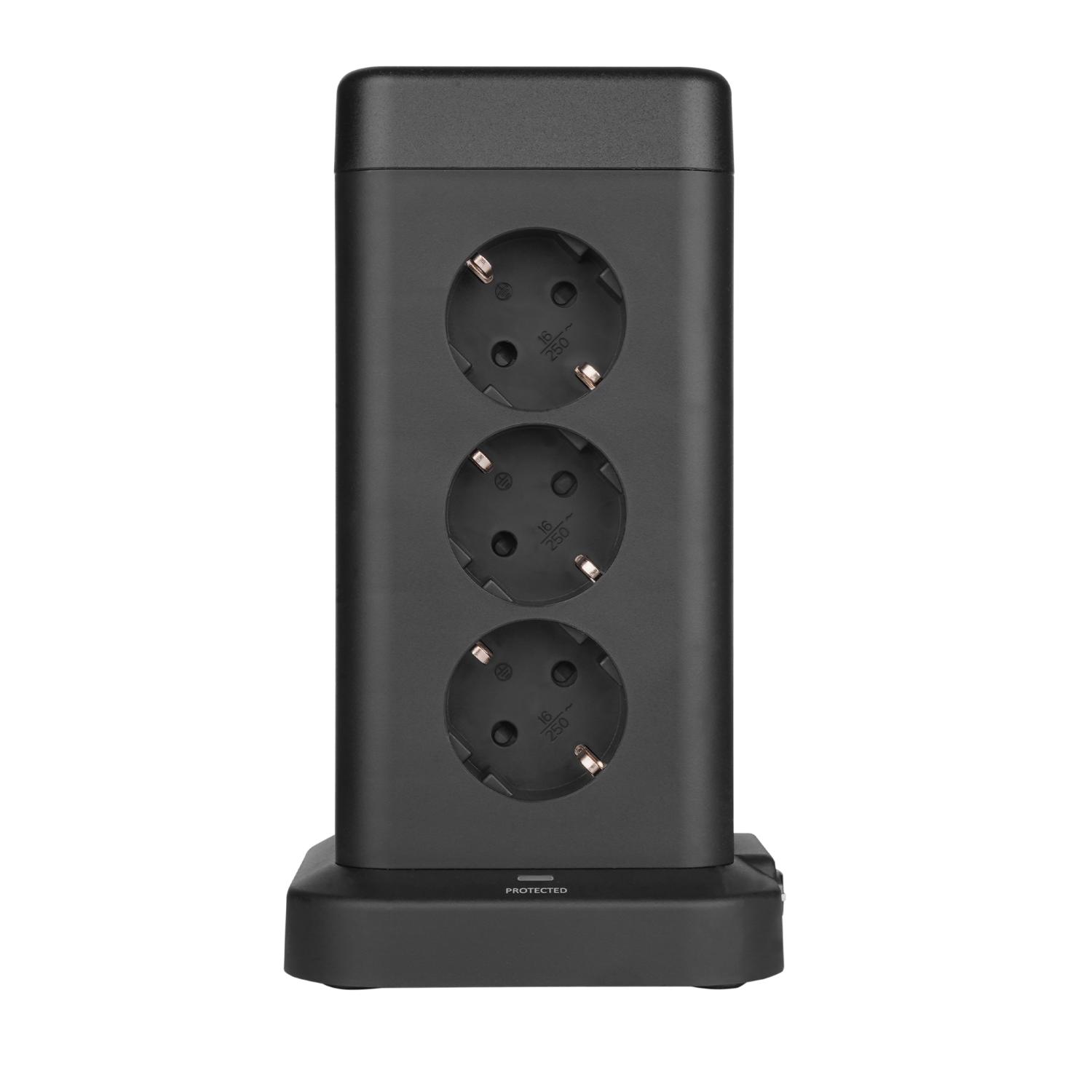 - Függőleges, helytakarékos kialakítás: Az innovatív torony design minimalizálja az asztalon vagy a padlón elfoglalt helyet, miközben minden oldalról könnyen hozzáférhetővé teszi az aljzatokat.