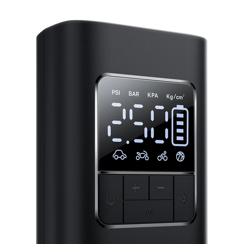 - Intelligens felfújási módok: Négy előre beállított mód áll rendelkezésre különböző eszközökhöz: autó (alapértelmezett: 2.2-2.8 bar), motorkerékpár/elektromos kerékpár (alapértelmezett: 1.8-2.8 bar), kerékpár (alapértelmezett: 30-90 psi) és labda (alapértelmezett: 7-9 psi). Az egygombos módválasztás egyszerűsíti a használatot.