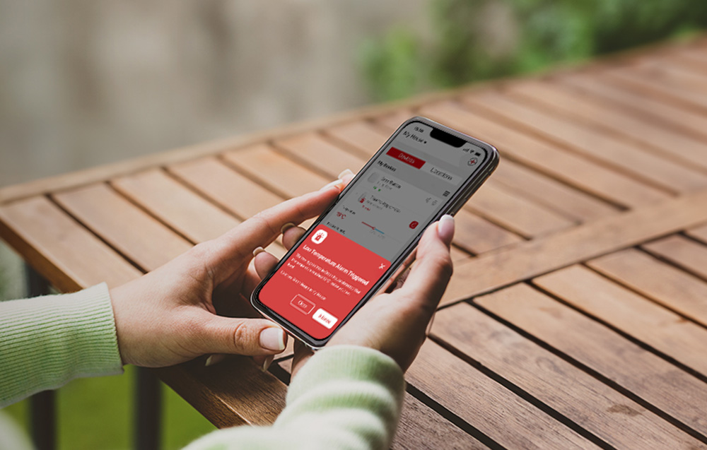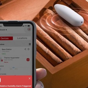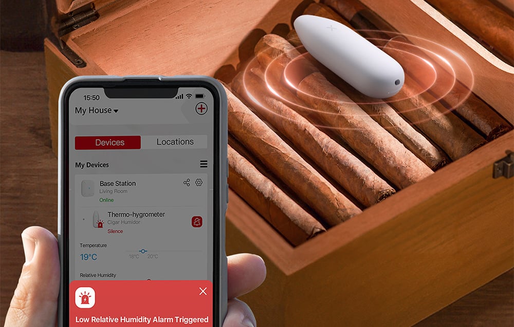 Azonnali push-értesítések: Amint a megfigyelt helyiségben a körülmények eltérnek a beállított normáktól, azonnal kap egy push értesítést a telefonjára. Ez biztosítja, hogy mindig gyorsan reagálhasson a kedvezőtlen változásokra, így elkerülheti az esetleges veszteségeket - például az értékes növények vagy a tárolt szivarok elvesztését.