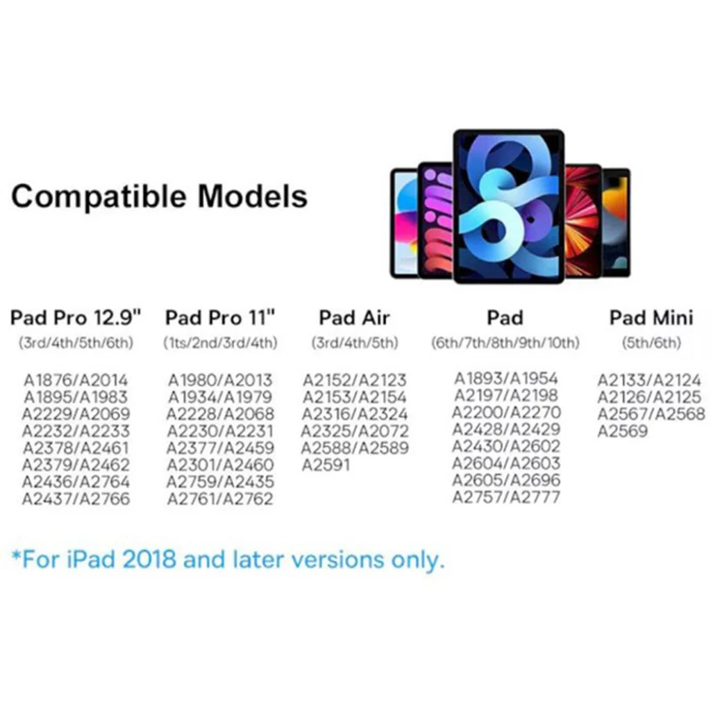 A Baseus Smooth Writing 2 Series stylus kizárólag a 2018-as és az utáni iPad modellekkel kompatibilis. Kérjük, ellenőrizze iPad modelljének A-számát (a készülék hátoldalán található) a vásárlás előtt: